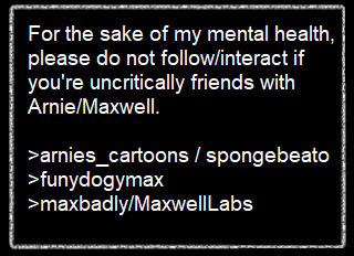 Do Not Interact if you are a self-identified Proshipper/Anti-Anti. if you have locked, private and heavily vetted coping accounts, i understand, but i have Zero Fucking Patience for Anti-Anti discourse of any kind and the wild irresponsibility it encourages.